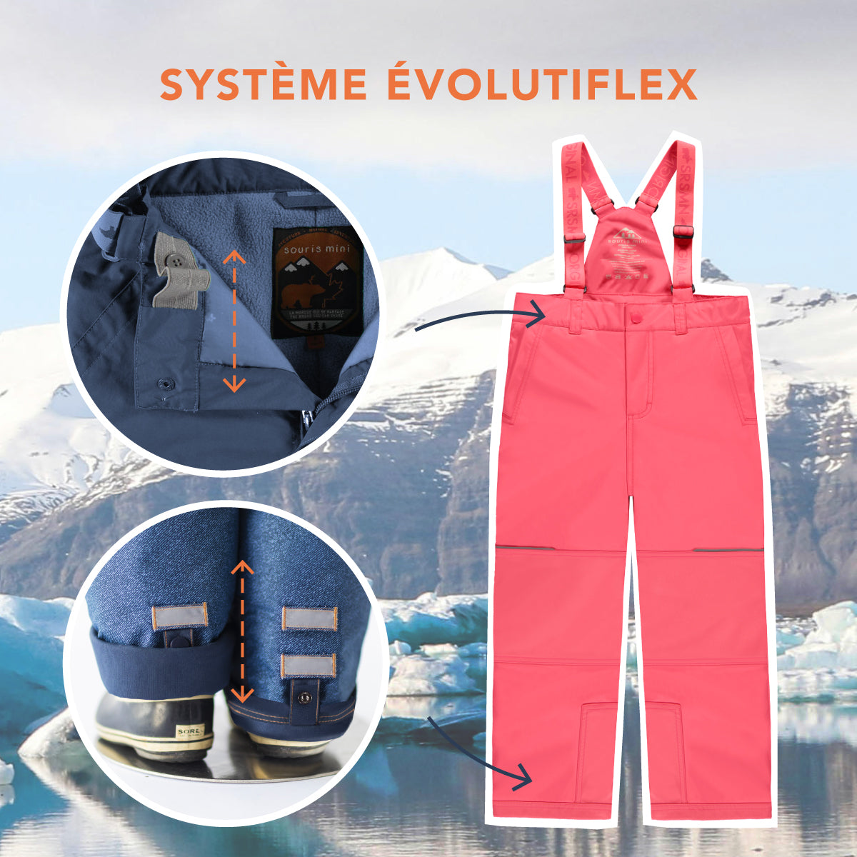 Avec notre système EVOLUTIFLEX, vos habits de neige seront portés plus longtemps! Les manches, les jambes et la taille offrent plusieurs ajustements.