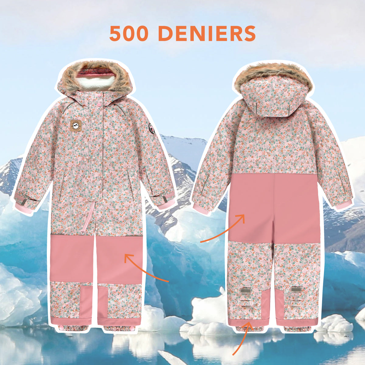 Des renforts ont été ajoutés aux genoux, fessier et chevilles, afin d'offrir à l'habit de neige une meilleure durabilité.