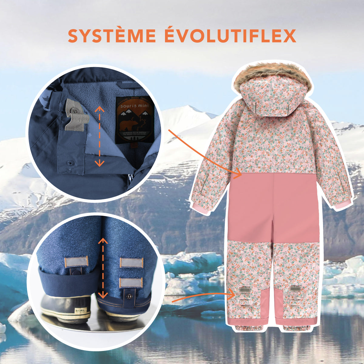 Avec notre système EVOLUTIFLEX, vos habits de neige seront portés plus longtemps! Les manches, les jambes et la taille offrent plusieurs ajustements.