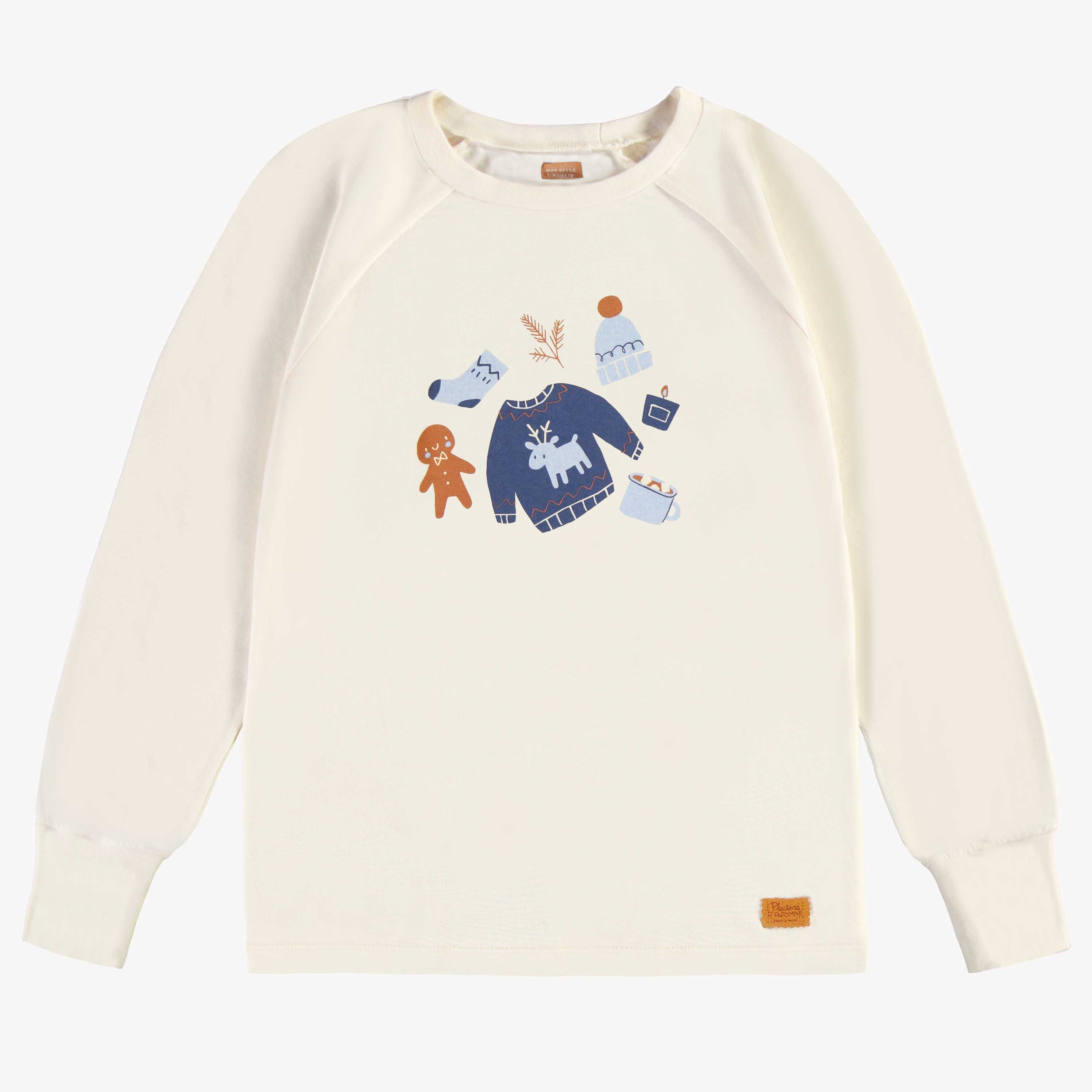 Haut de pyjama crème à manches raglan longues et un col rond avec un imprimé d'items sur une thématique automnale : un chandail, bas et tuque de maille bleus, une bougie et un biscuit en pain d'épice. Fait en confortable jersey de coton.
