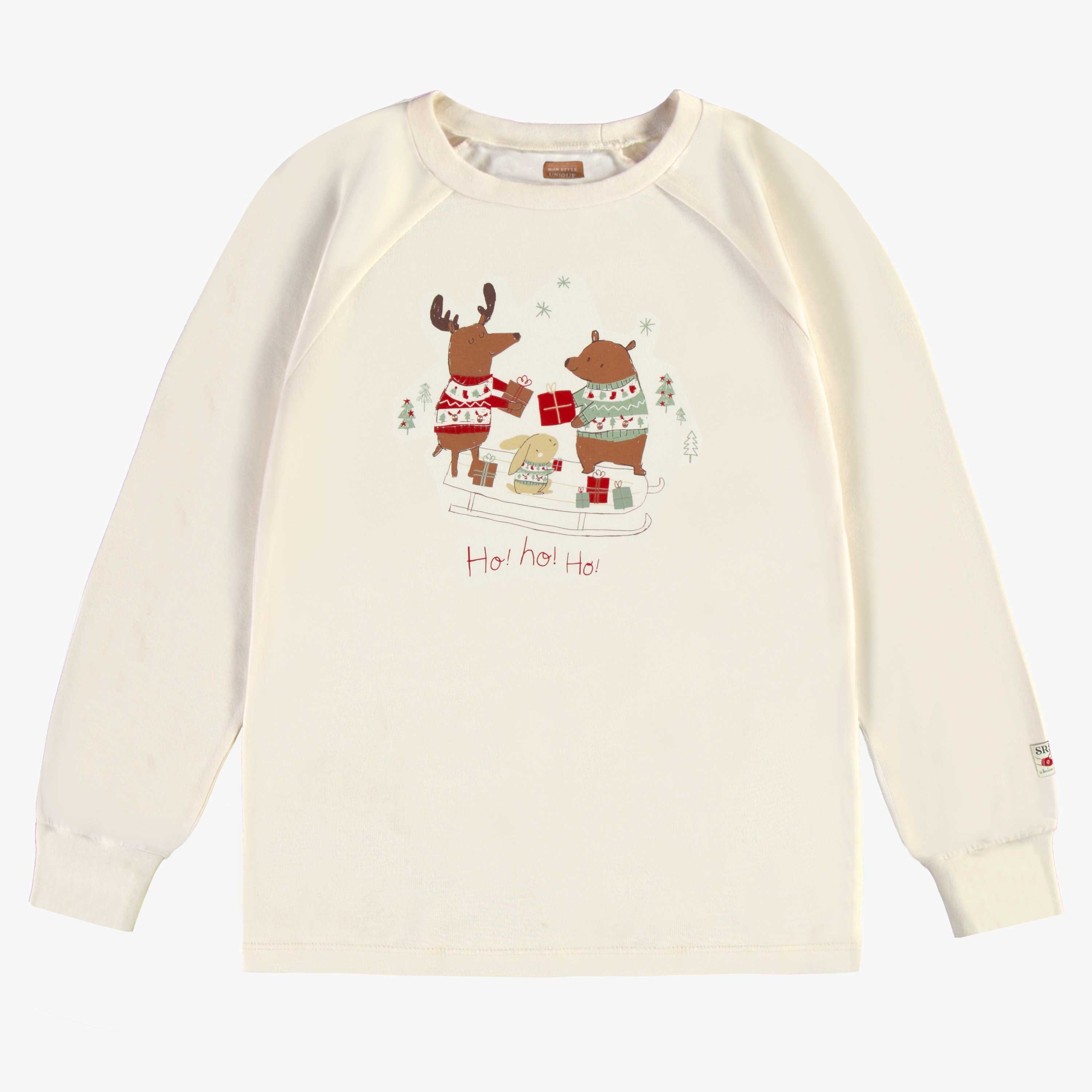 Haut de pyjama crème à manches longues raglan avec une illustration représentant des amis : un ours, un lapin et un renne qui font un échange de cadeaux.