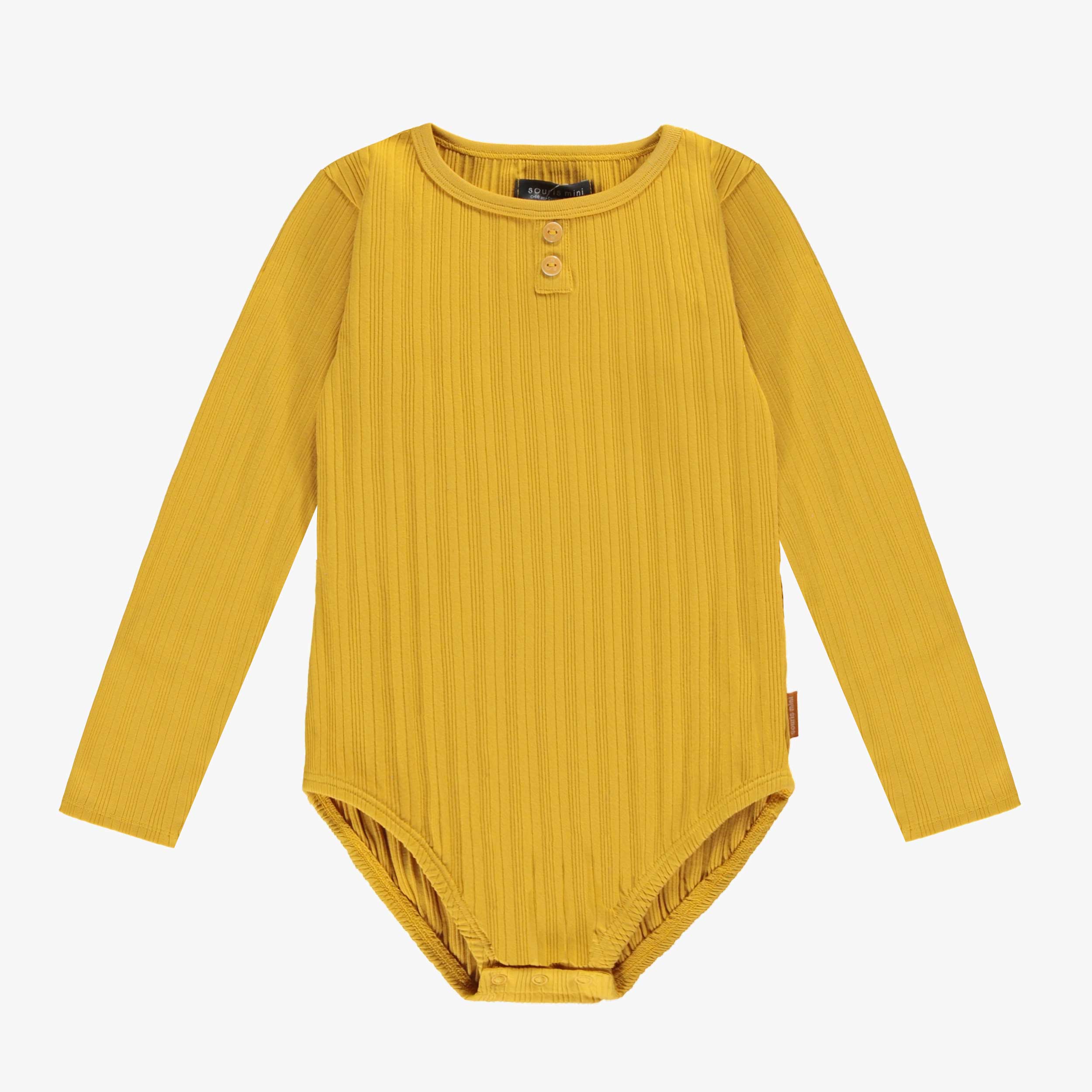 Justaucorps jaune à manches longues avec col rond, patte de boutonnage et boutons-pression à l’entrejambe fait en tricot côtelé.