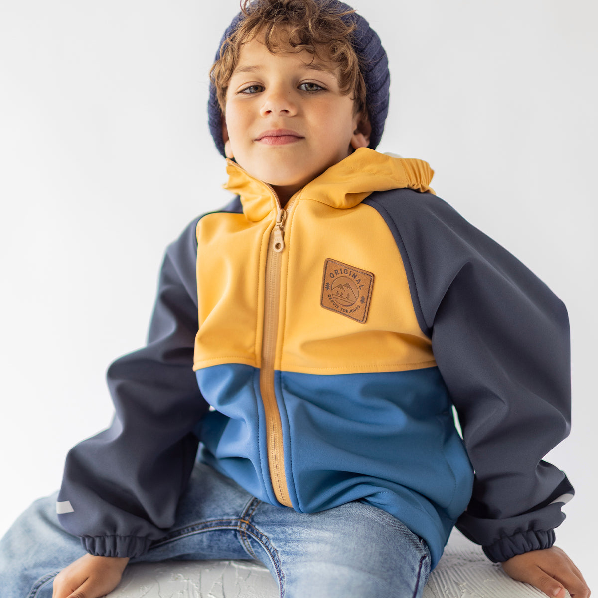Manteau bleu et jaune en coquille souple, enfant