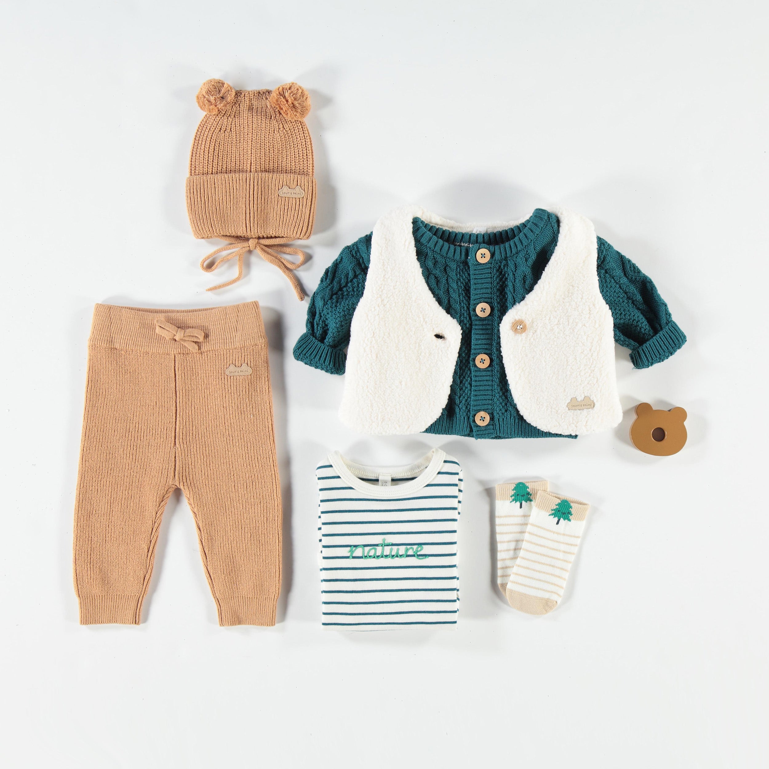 Pantalon beige en tricot pour un look confortable. La taille et les chevilles sont en tricot côtelé pour un meilleur ajustement. Comprend une petite boucle décorative à l’avant pour une touche mignonne. Taille et chevilles en tricot côtelé Boucle décorative Doux tricot