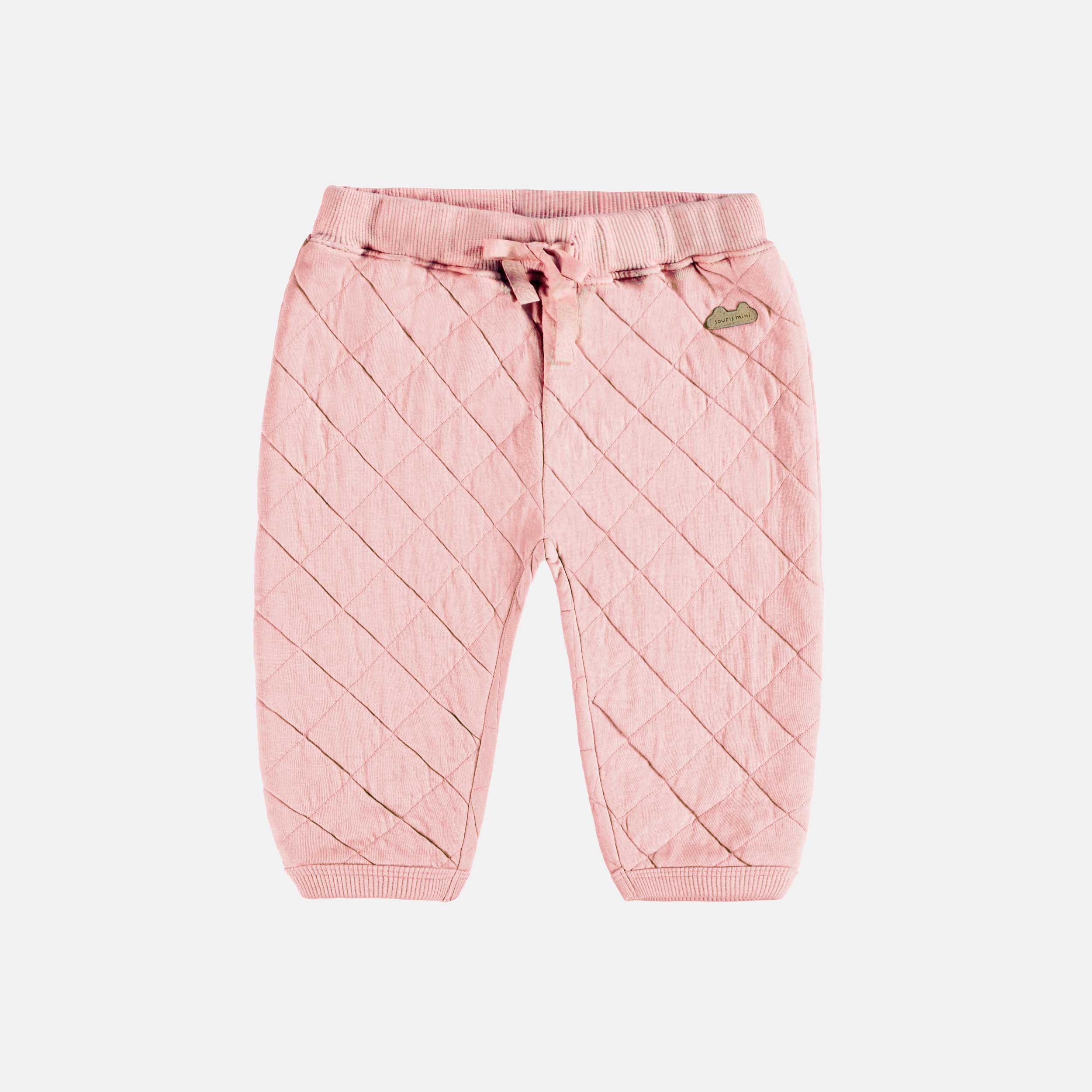 Pantalon rose pâle de style jogging en jersey matelassé avec la taille et les chevilles élastiques en maille côtelée et un cordon d’ajustement à la taille.