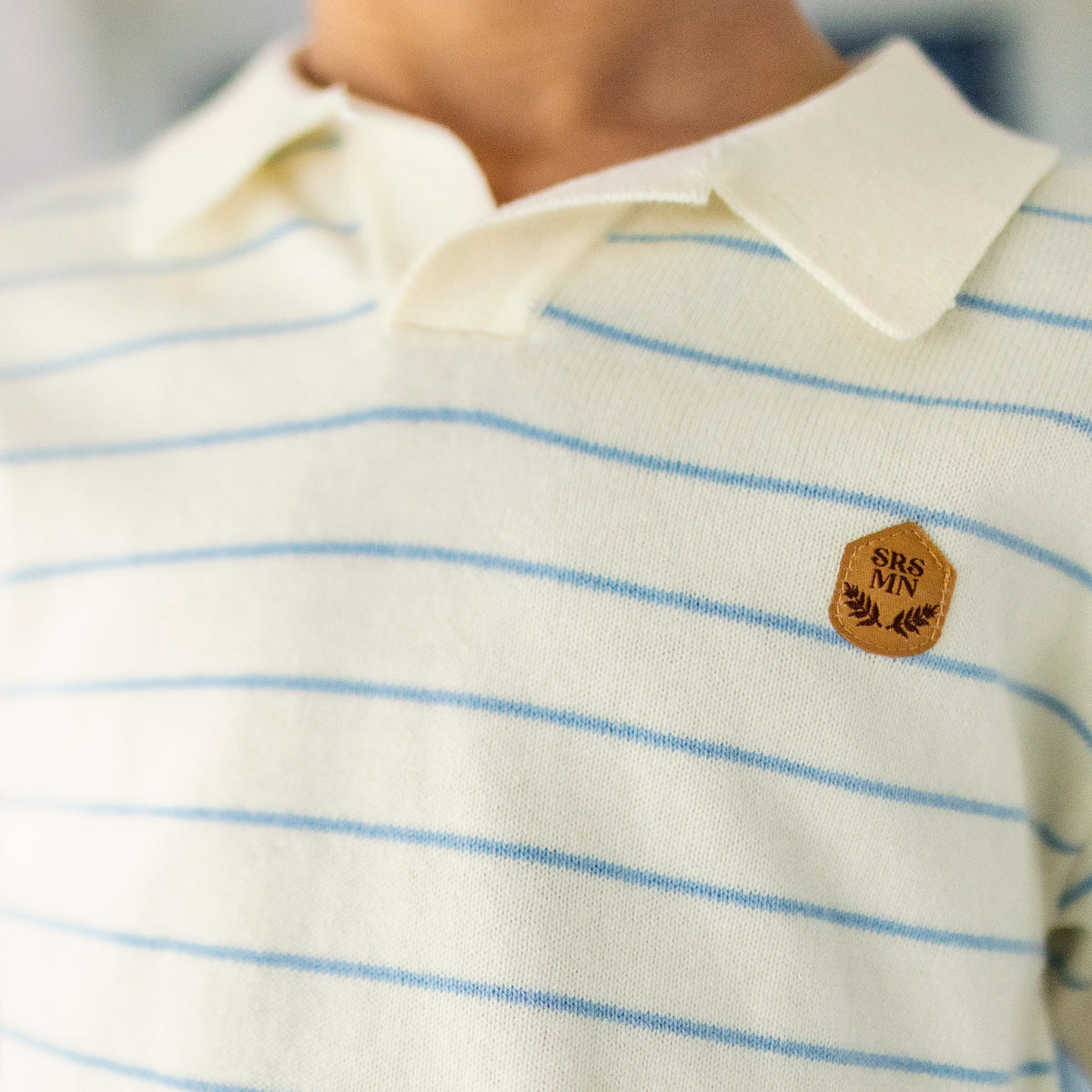 T-shirt à col polo et manches courtes crème et bleu à rayures, coupe régulière, en maille légère 100% coton. Le col, les manches et le bas sont en maille côtelée.Une pièce intemporelle et unique idéale pour créer un look chic ou pour un look décontracté de tous les jours. Agencer avec un denim et une casquette pour le look décontracté ou avec pantalon bleu avec un chapeau de soleil uni pour le look chic et nautique. -Maille-Coupe régulière-Chic ou décontracté-Col polo, manches et bas en maille côtelée