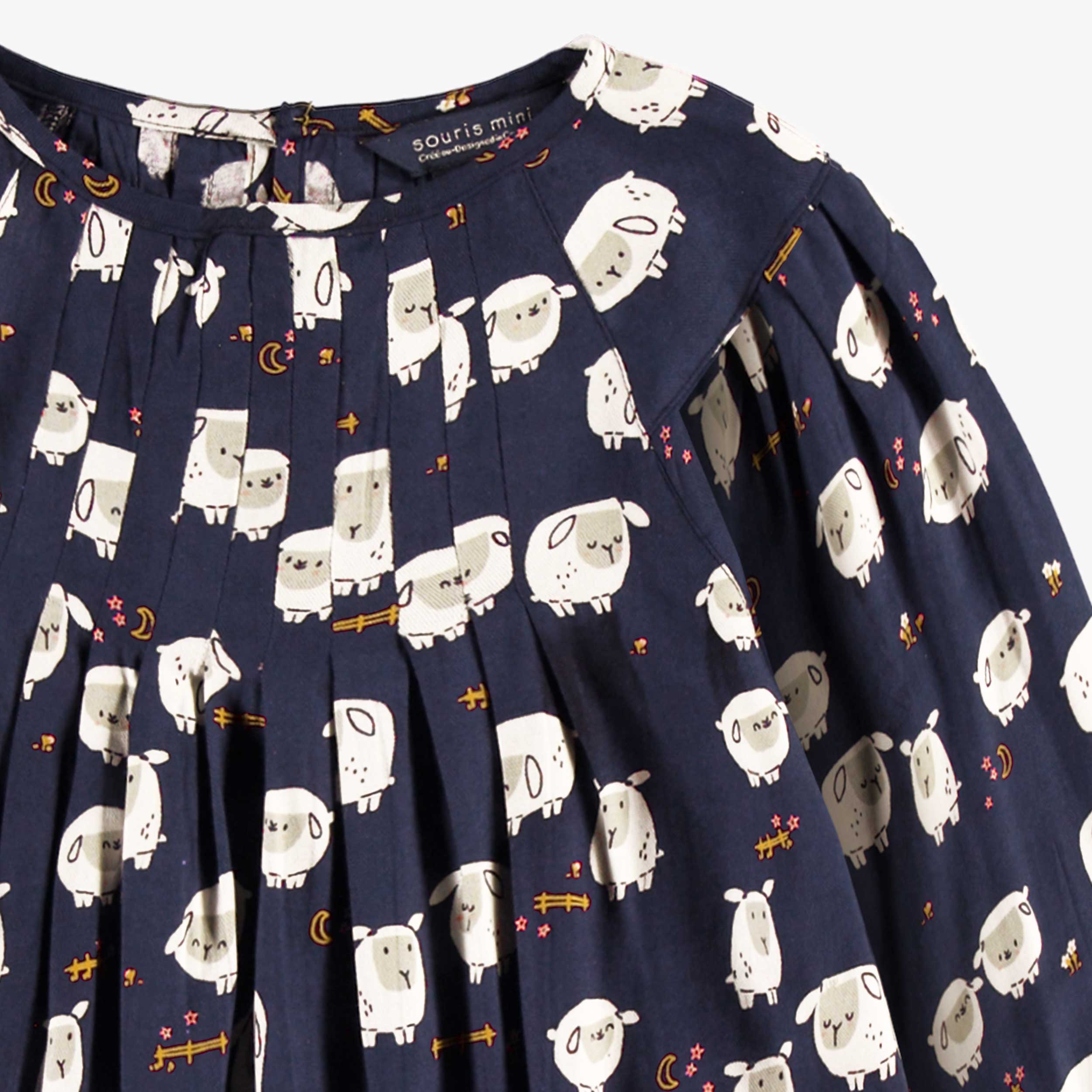 Robe bleu marine avec des motifs de moutons adorables. Avec un col rond et une fermeture à bouton au dos pour faciliter l’habillement. Les poignets sont élastiques pour permettre un meilleur ajustement. Grâce à sa coupe évasée, votre petite va adorer tournoyer avec cette tenue! Coupe évasée Col rond Poignets élastiques Motifs de moutons Viscose