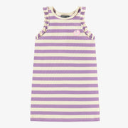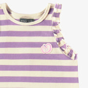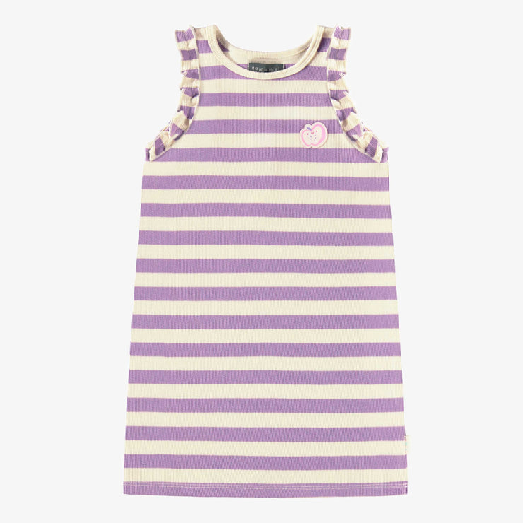 Robe crème et mauve avec un mignon écusson de pomme. Comprend un col rond de larges bretelles et des volants aux ouvertures des bras. Fabriquée en confortable tricot côtelé dans une coupe ajustée. Un morceau simple et pratique qui s’agence bien avec tout!