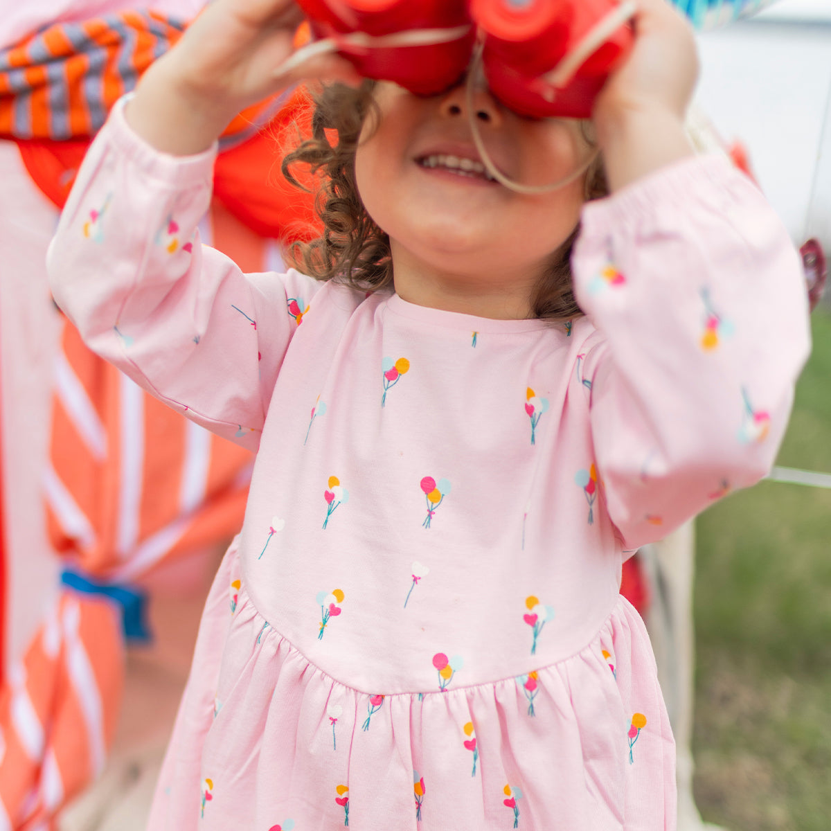 Robe rose avec des motifs de bouquets de ballons. Comprend un col rond et des manches longues avec des poignets élastiques. On y retrouve un jupon en tulle souple pour ajouter une touche de volume. Fabriquée en jersey de coton extensible dans une coupe régulière évasée. Jersey de coton extensible Coupe régulière évasée Manches longues Poignets élastiques Col rond