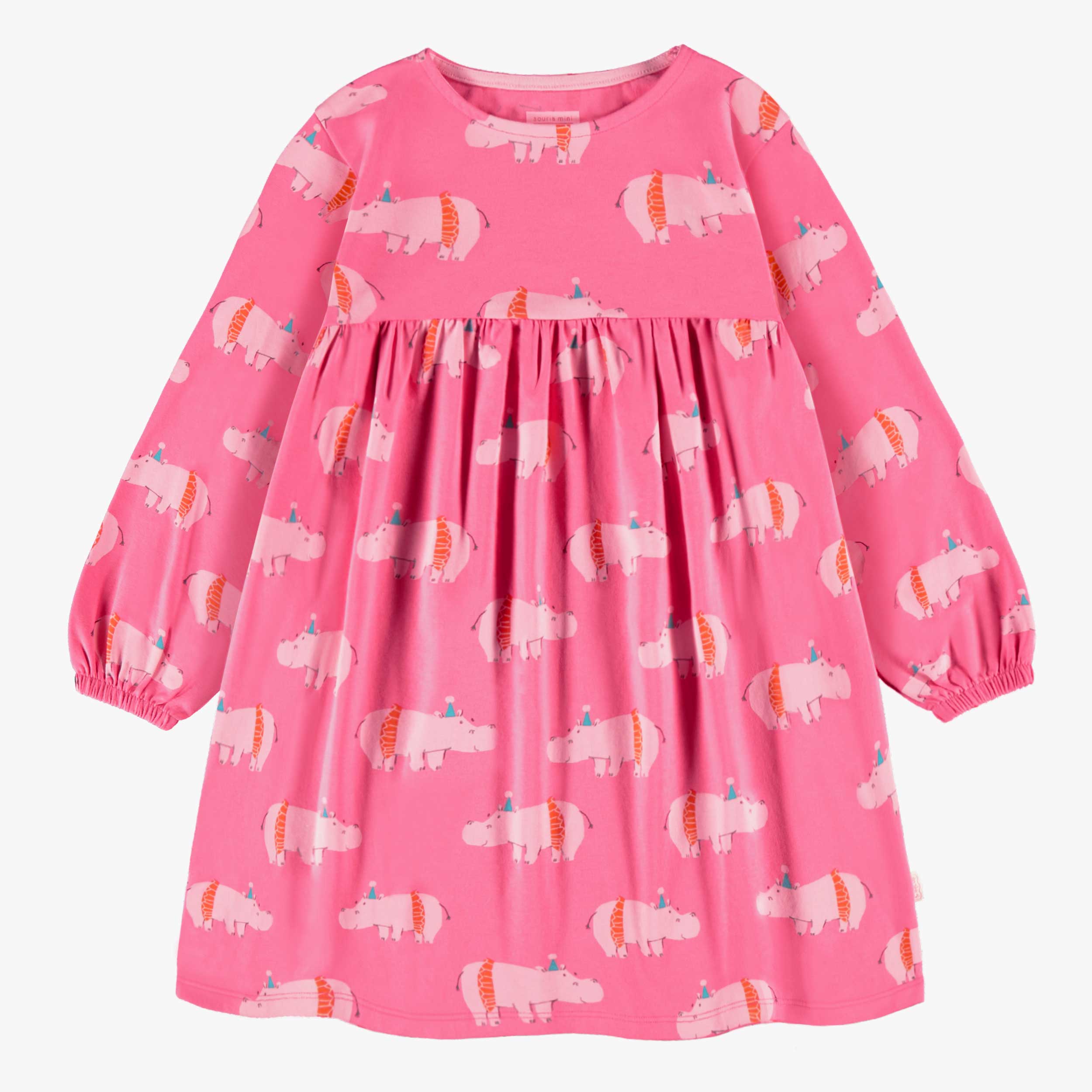 Robe rose avec des motifs amusants d’hippopotames en mode cirque! Comprend un col rond, des manches longues et des poignets élastiques pour un meilleur ajustement. Fabriquée en confortable jersey de coton dans une coupe régulière évasée. Jersey de coton Coupe régulière évasée Manches longues Poignets élastiques Col rond