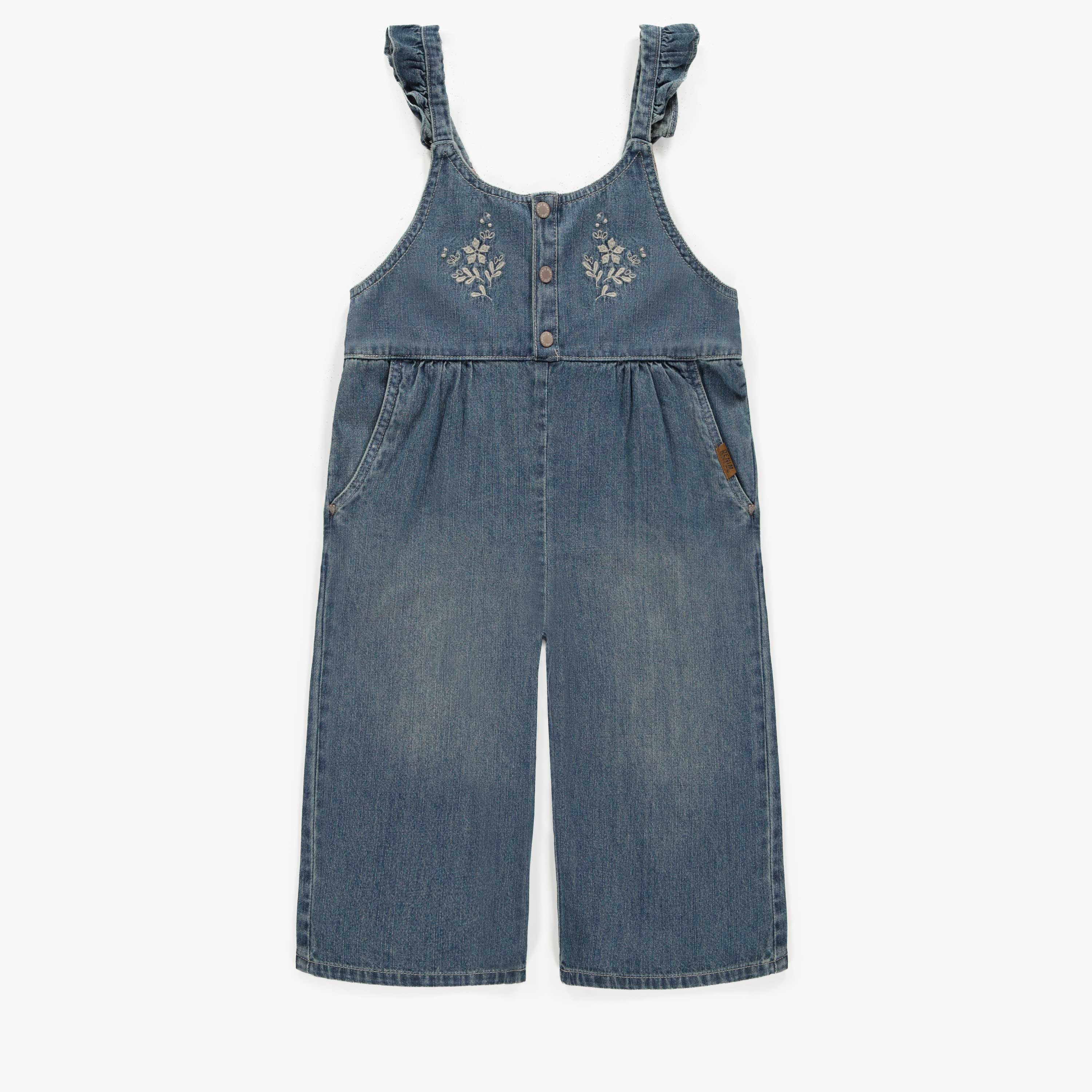 Salopette 7/8 à jambes larges en denim léger bleu moyen offrant confort et fluidité. D’un style intemporel, ce vêtement peut être porté pour toute occasion assurant liberté de mouvement à votre mini.