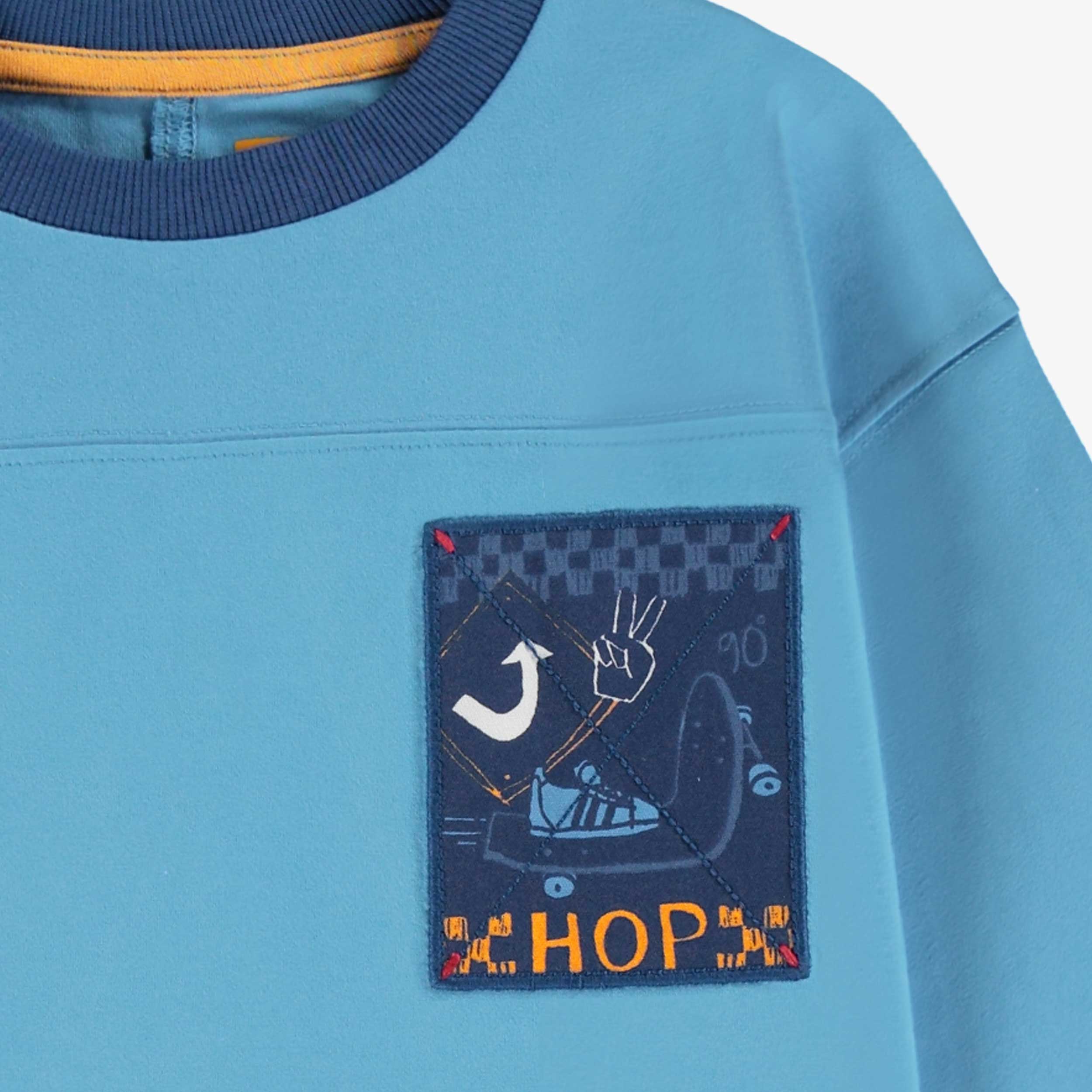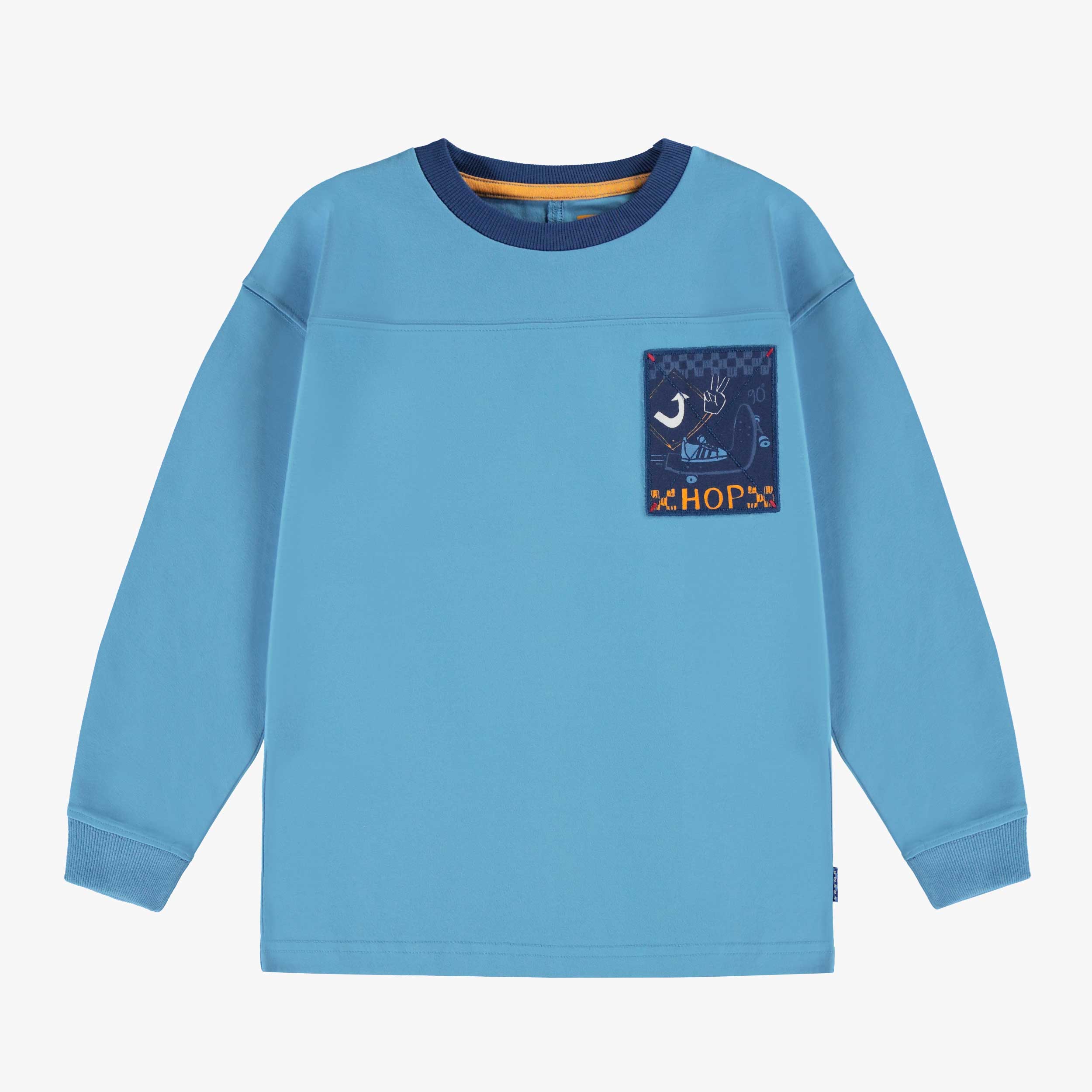 T-shirt bleu à manches longues avec une illustration brodée de planche à roulettes. Col rond et poignets en tricot côtelé pour un meilleur ajustement. Fabriqué en jersey confortable. Jersey confortable Manches longues Col rond Poignets en tricot côtelé Illustration d’une planche à roulettes