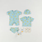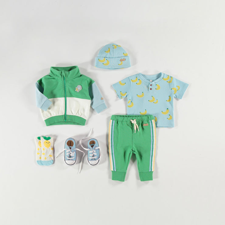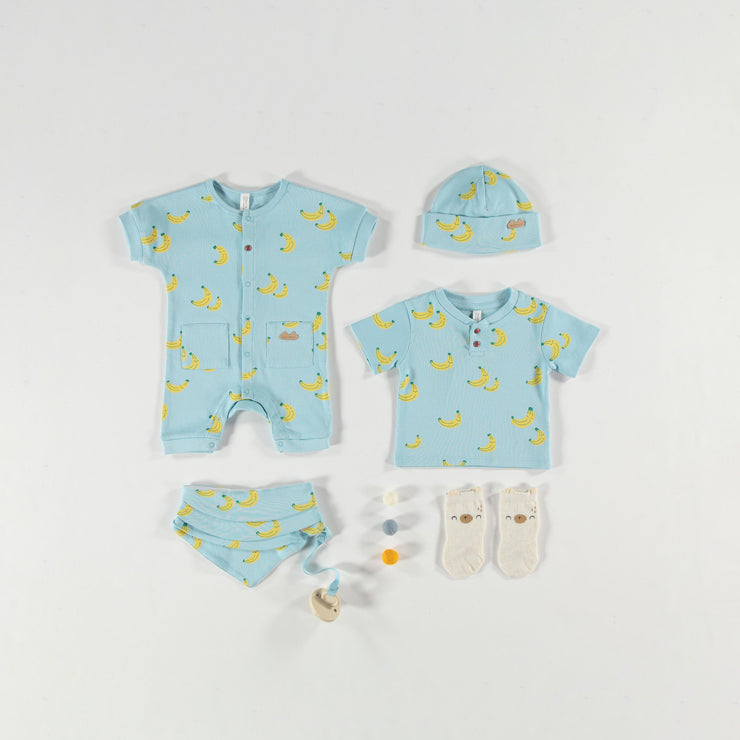 T-shirt bleu à manches courtes, coupe régulière, col rond, bas droit, avec patte de boutonnage et motifs de bananes, en fin tricot de coton côtelé.Ce vêtement est tout à fait adorable avec sa couleur, son look sportif et son motif fruité.Un style classique qui invite les beaux jours dans la garde-robe ! Agencer avec le chandail à fermeture éclair et le pantalon en coton français.-Tricot côtelé-Coupe et longueur régulières-Manches courtes-Col rond-Bas droit