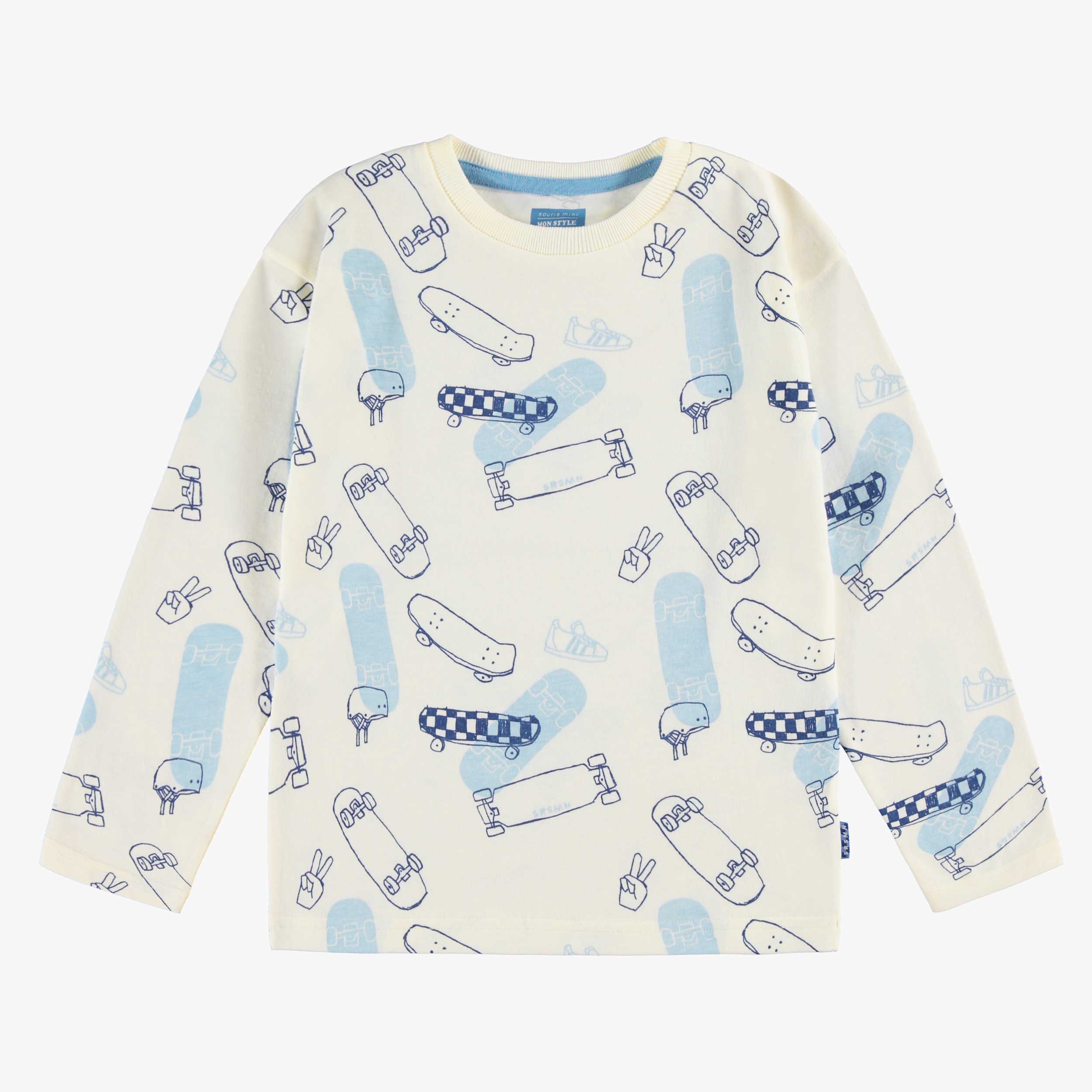 T-shirt crème avec un imprimé de planches à roulettes. Col rond, manches longues et fabriqué en confortable jersey. Manches longues Col rond Imprimé de planches à roulettes Jersey confortable