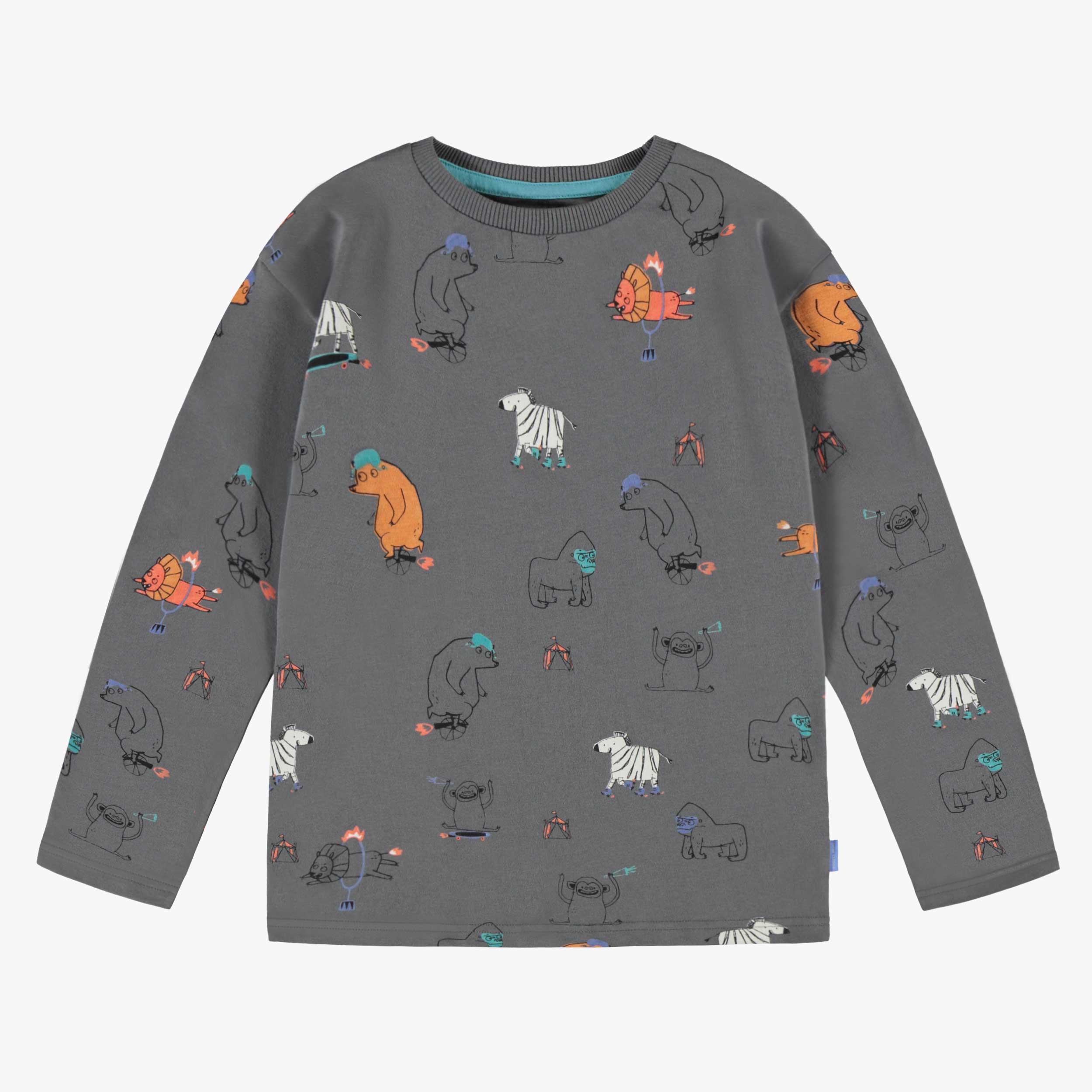 T-shirt gris avec des motifs d’animaux amusants en mode cirque! Comprend des manches longues et un col rond côtelé. Fabriquée en jersey de coton dans une coupe décontractée pour un maximum de confort. Jersey de coton Coupe décontractée Manches longues Col rond