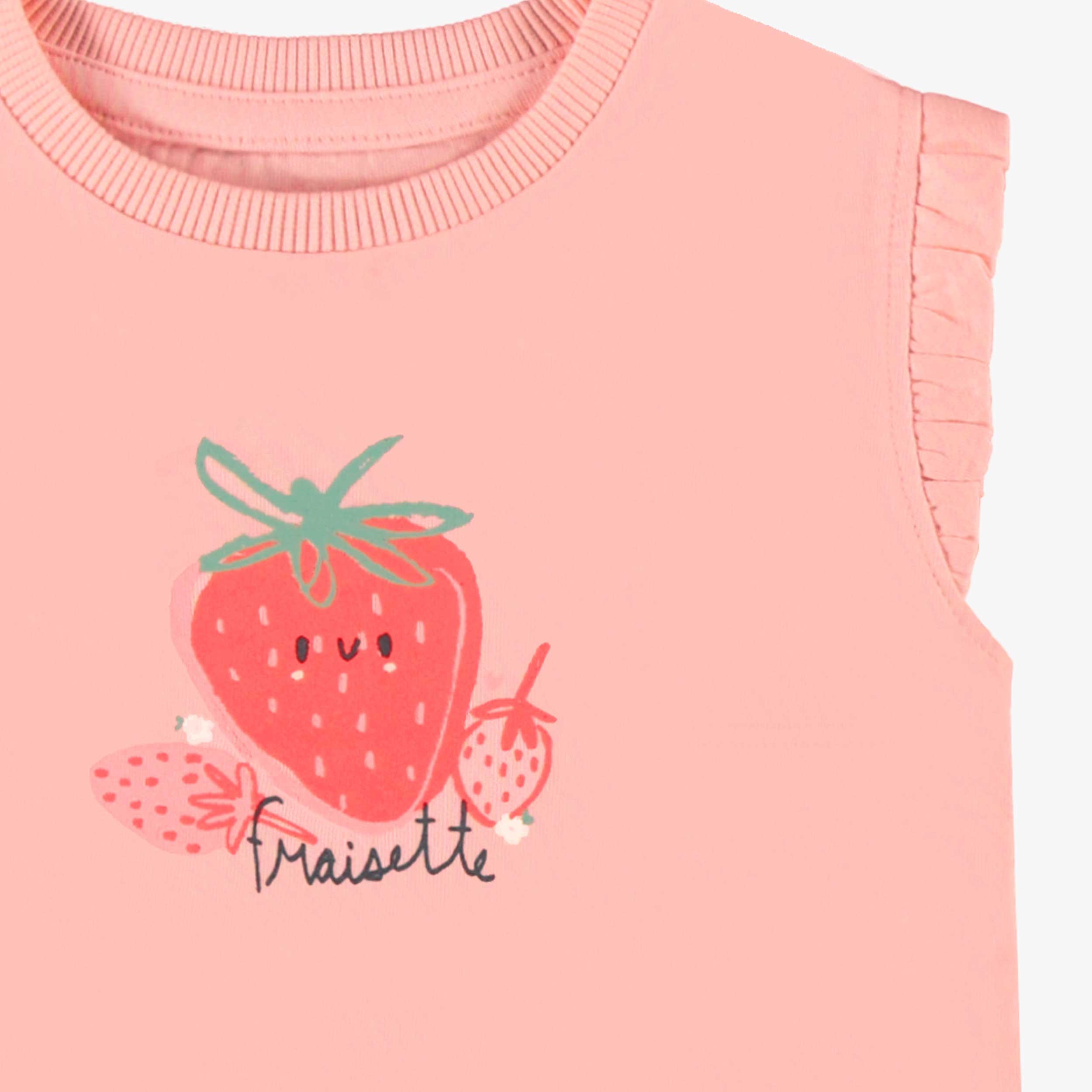T-shirt sans manches rose avec une illustration de fraises. Comprend un col rond en tricot côtelé et des volants aux ouvertures des bras. Fabriqué en doux jersey de coton dans une coupe décontractée.