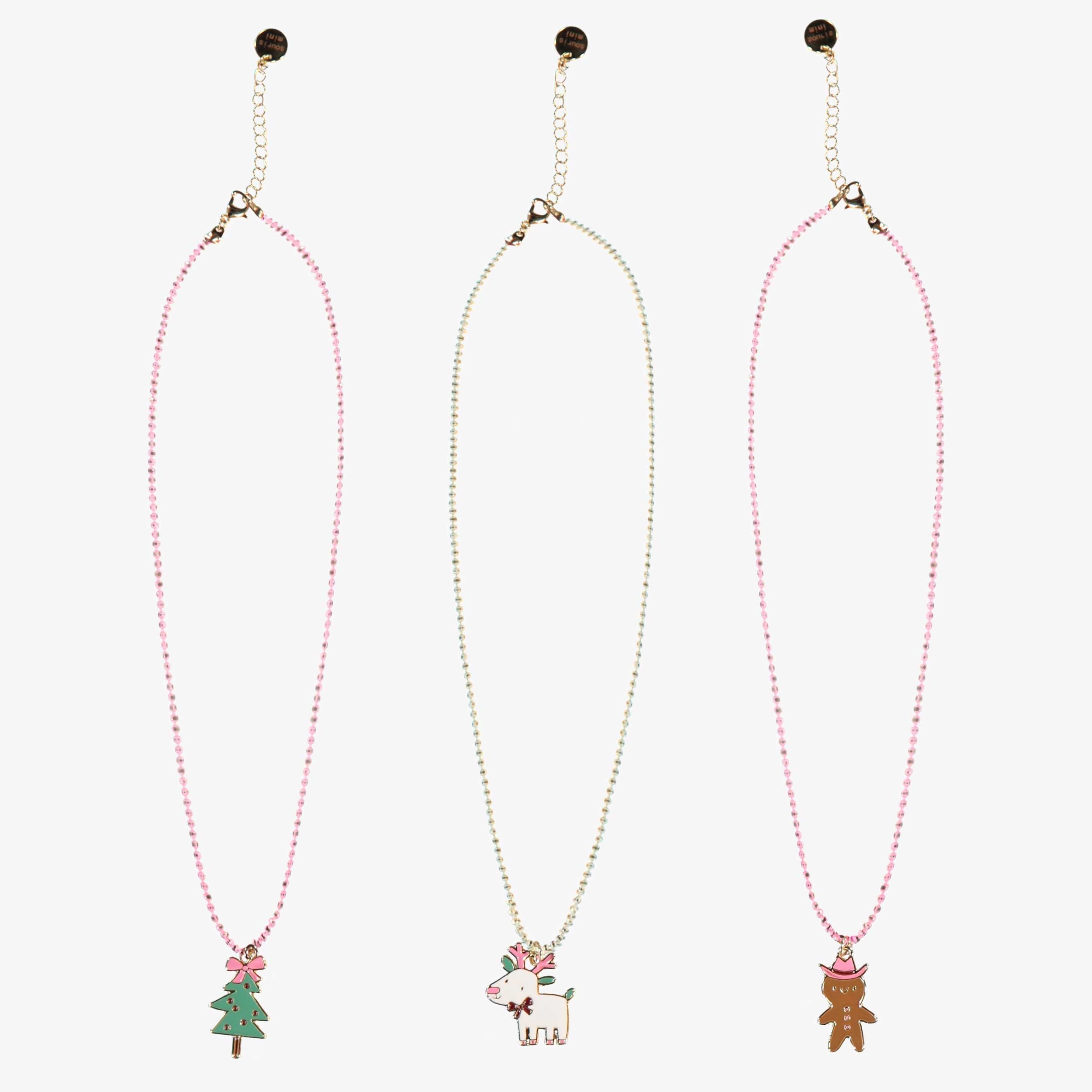Trio de colliers avec un pendentif pain d’épice, un pendentif renne et un pendentif sapin. Chaque collier est muni d’une chaînette ajustable pour choisir la longueur désirée. Un joli détail qui ajoutera une touche d’élégance aux tenues de votre enfant.