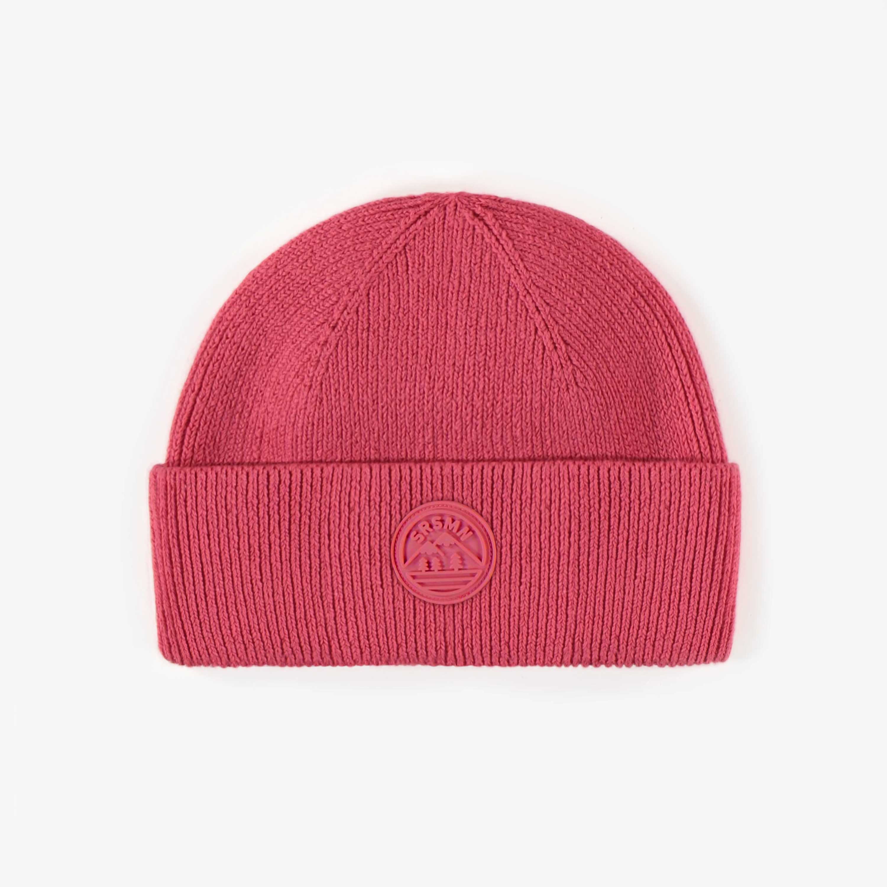 Tuque de maille de couleur rose foncé avec le dessus arrondi faite en douce et chaude maille de coton. Idéal pour les mi-saison!