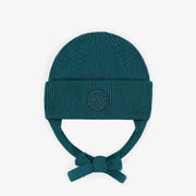 Tuque turquoise de maille douce pour la peau sensible de votre bébé composé à 100% de fibre naturelle.