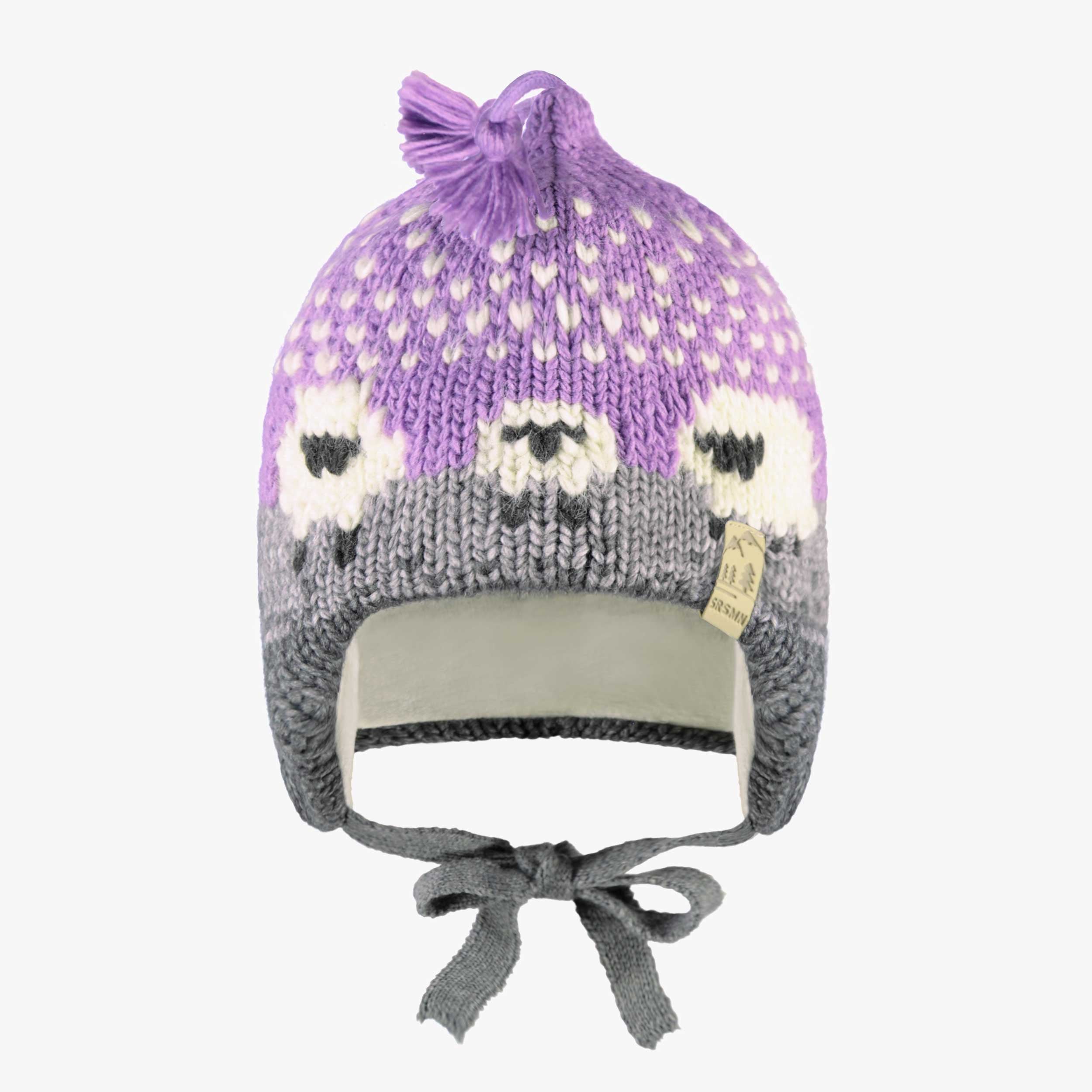 Tuque mauve en tricot avec des mignons moutons. On y retrouve une douce doublure pour un maximum de chaleur ainsi que des cordons à nouer qui permettent à la tuque de bien rester en place sur la tête de bébé. Munie d’un beau pompon décoratif. À porter avec le cache-cou et les mitaines assorties.