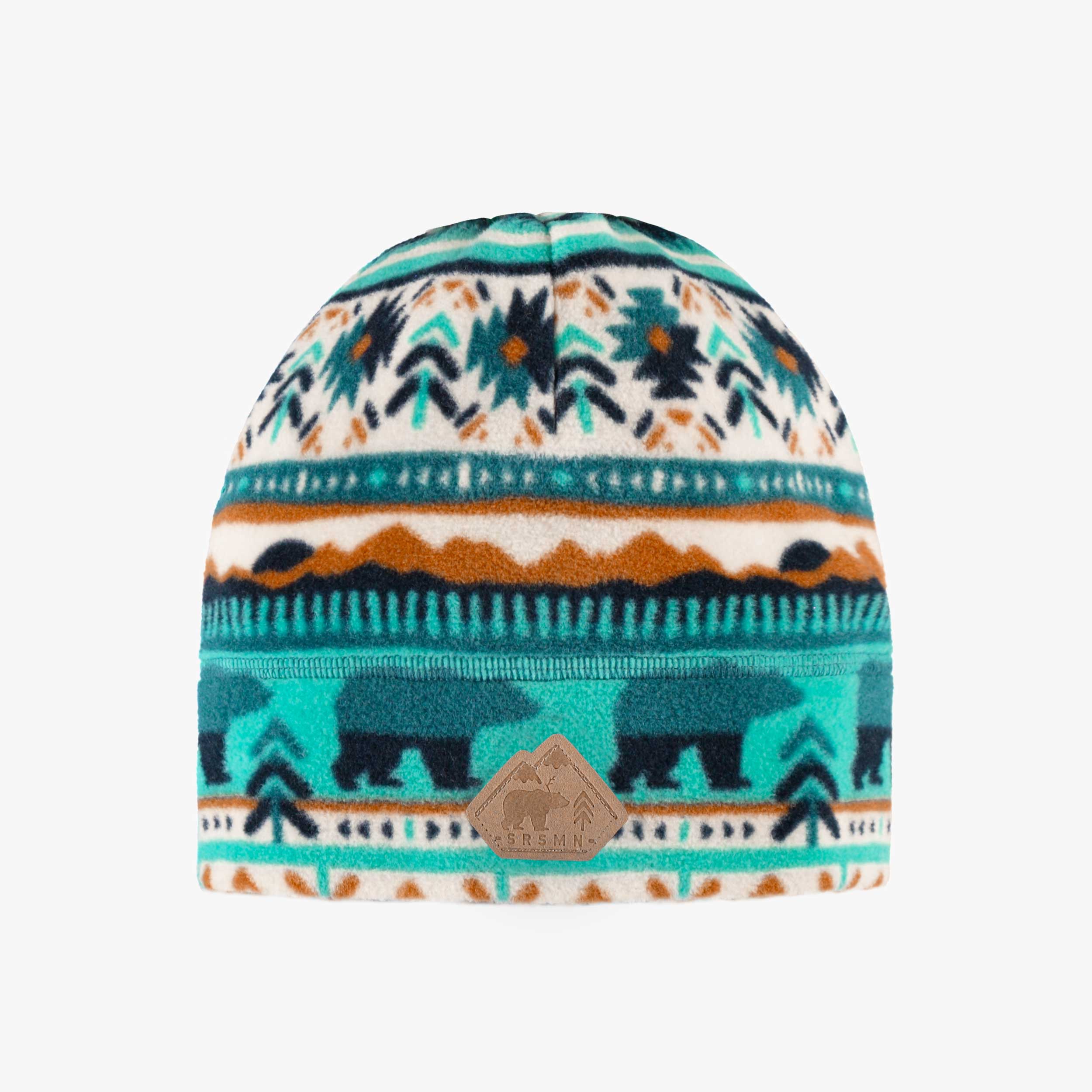 Tuque turquoise et crème à motifs hivernaux faite d’un doux et chaud polar en polyester aux couleurs vibrantes.