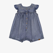 Une-pièce bleu en denim avec des broderies à l’avant. Comprend un col rond et des volants aux manches pour un look totalement féminin. Muni de boutons-pression à l’avant ainsi qu’à l’entrejambe afin de faciliter l’habillage.