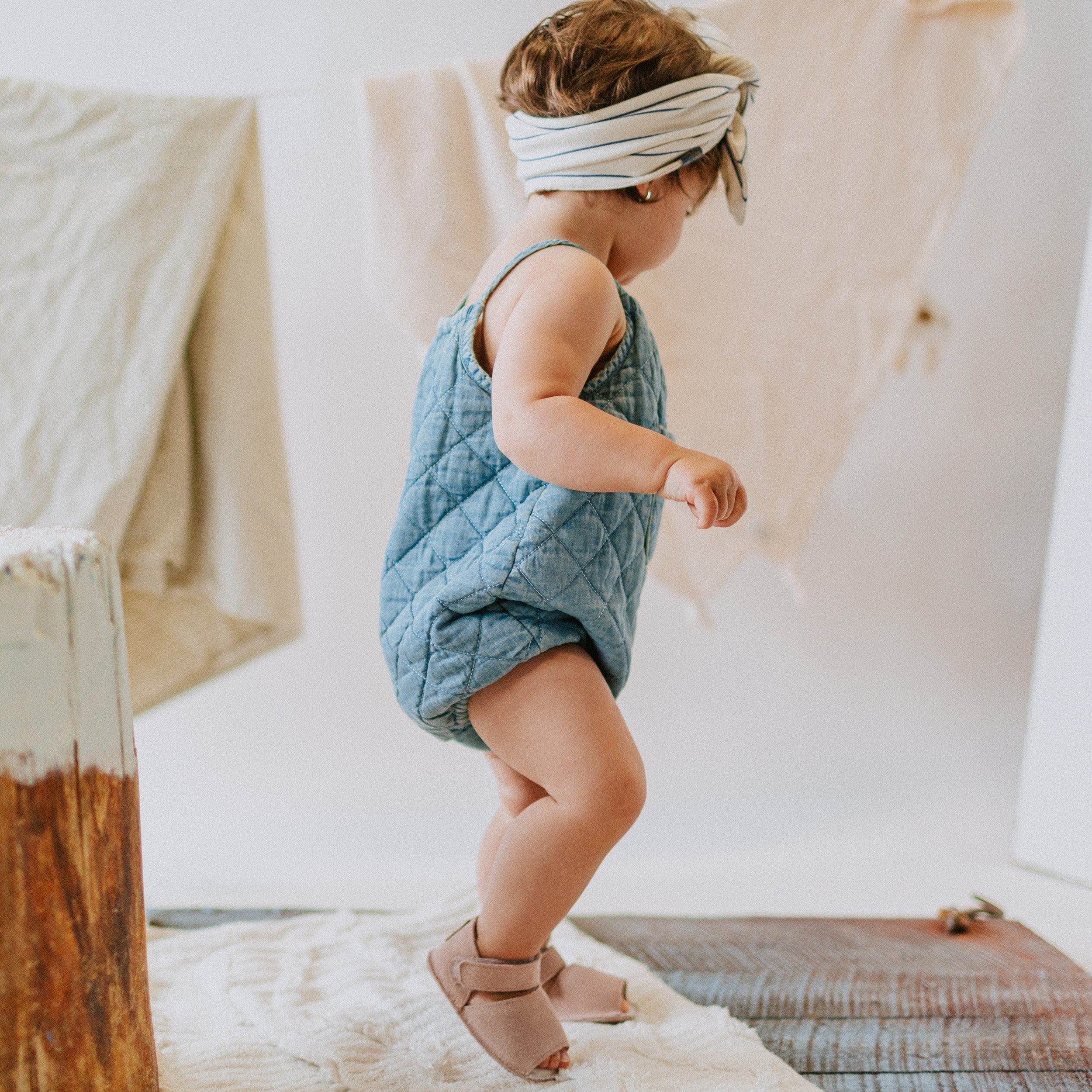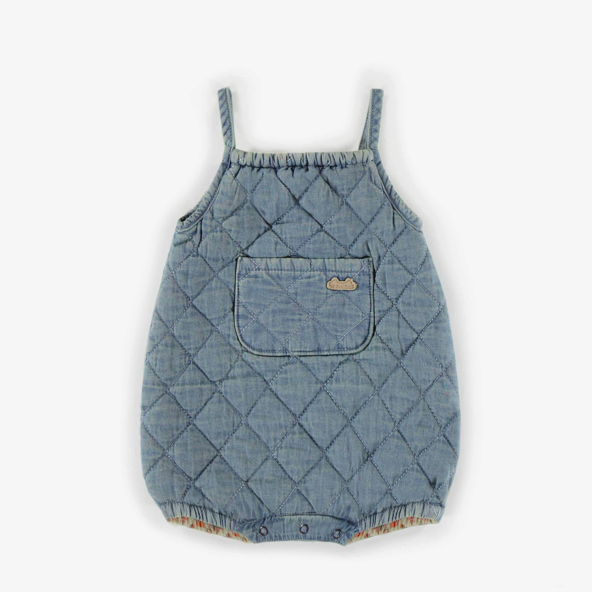 Une-pièce court en denim matelassé à col carré et une poche à l’avant, avec boutons-pression à l’entre-jambe pour l’enfiler.