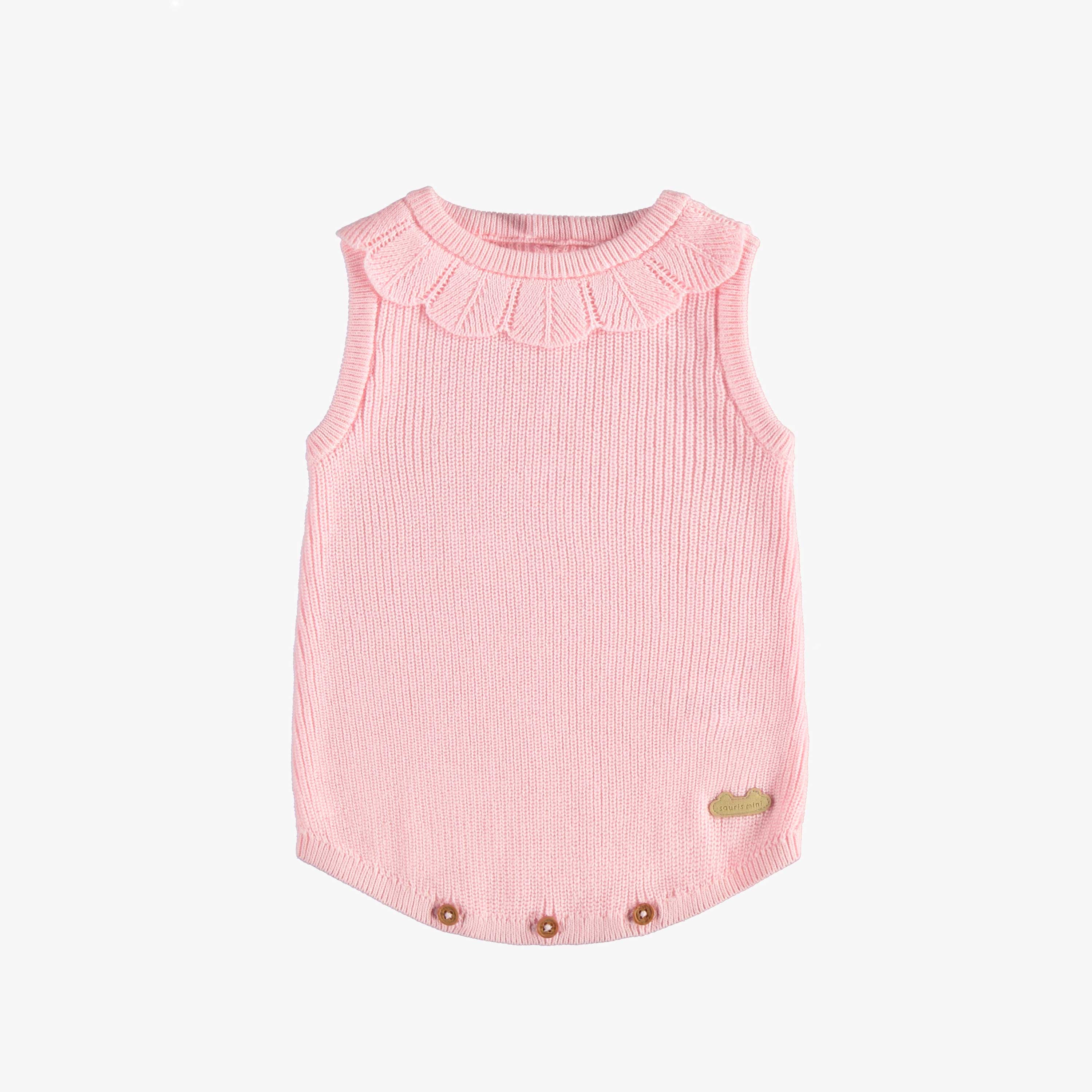 Une pièce rose en maille à bretelles larges, col rond avec col crochetée et ouverture à l’entre jambe avec boutons imitation bois, confectionné en 100% coton.