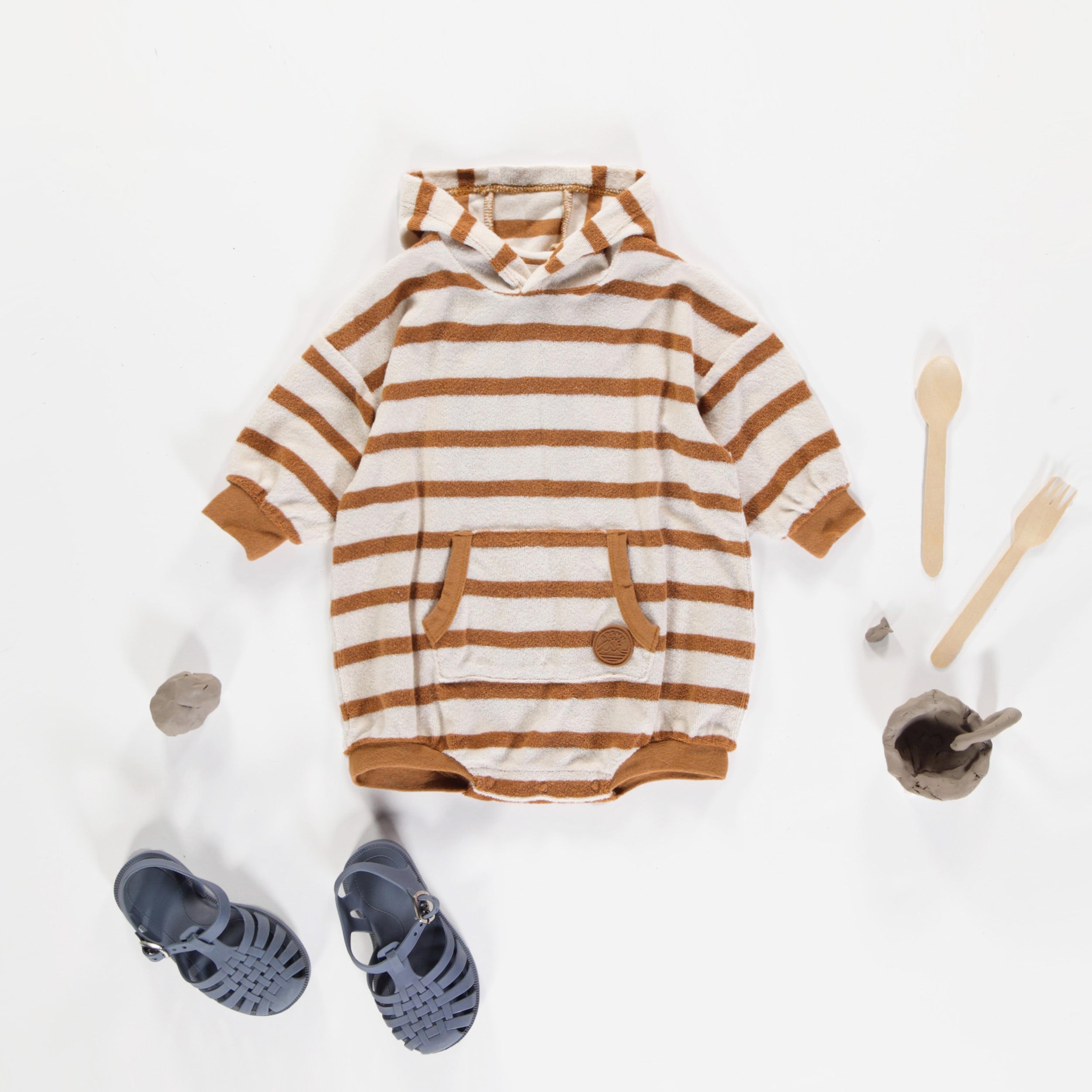 Une pièce rayée crème et caramel avec capuche et manches longues en tissu éponge.