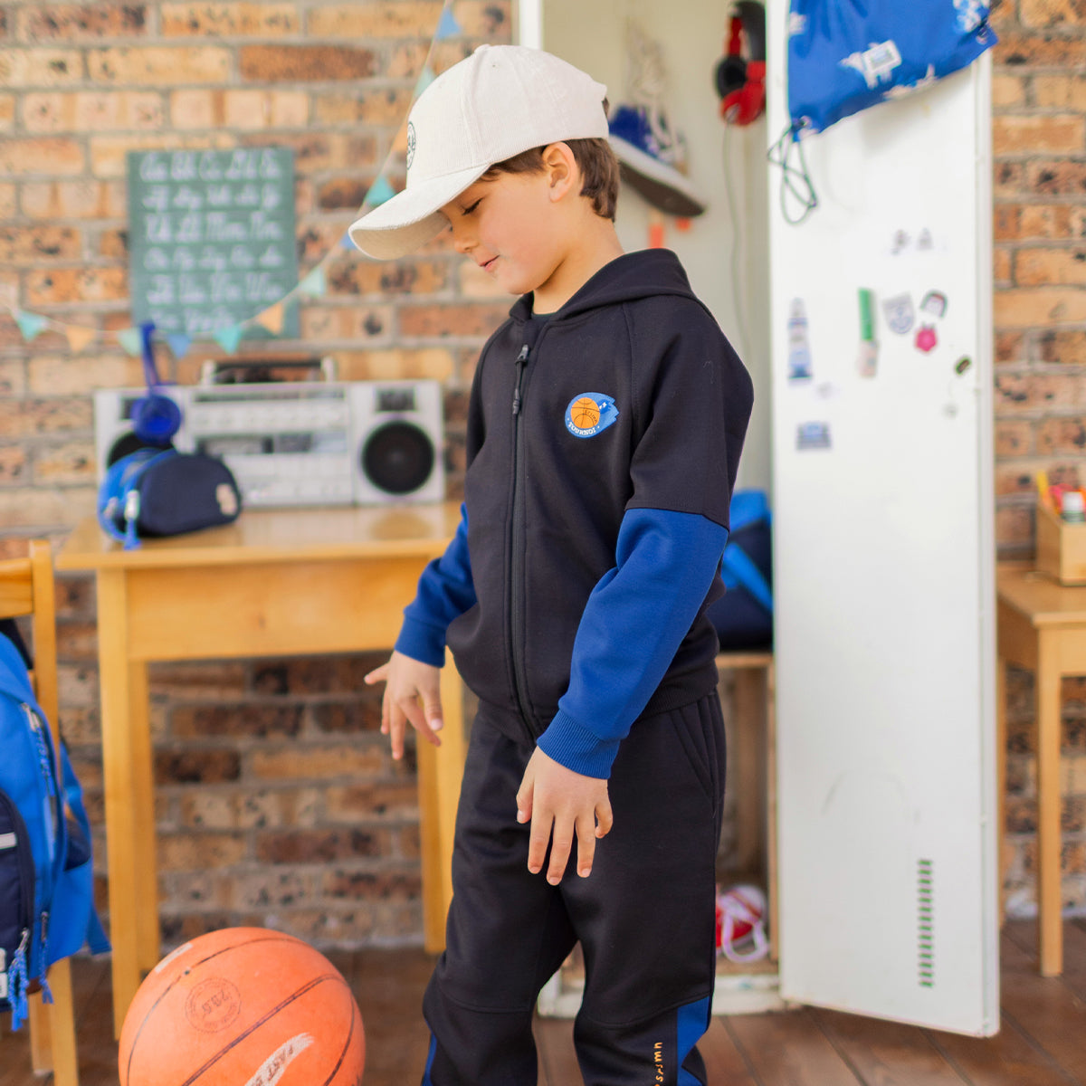 Veste à capuchon noire avec un bel écusson de ballon de basketball. On adore le bloc de couleur au niveau de la manche! On y retrouve deux poches ainsi qu’une fermeture éclair avec protège-menton. Le bas de la veste ainsi que les poignets sont en tricot côtelé pour un meilleur ajustement. Fabriqué en confortable tissu de style scuba dans une coupe ample.