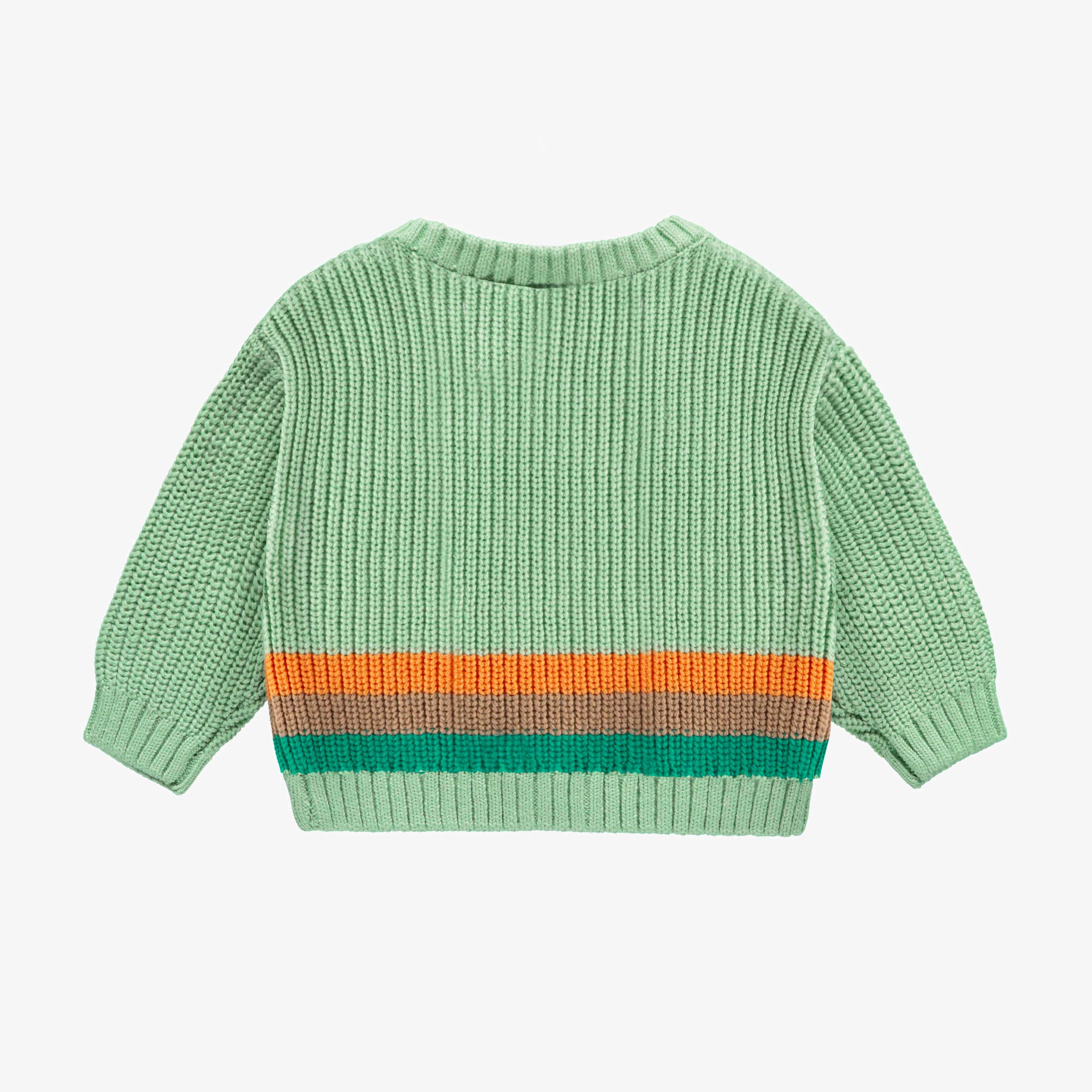 Veste verte à manches longues raglan, coupe décontractée, col rond, ouverture à l’avant avec boutons en imitation bois, maille côtelée avec blocs de couleurs, motif jacquard de chien mignon, 100% coton.