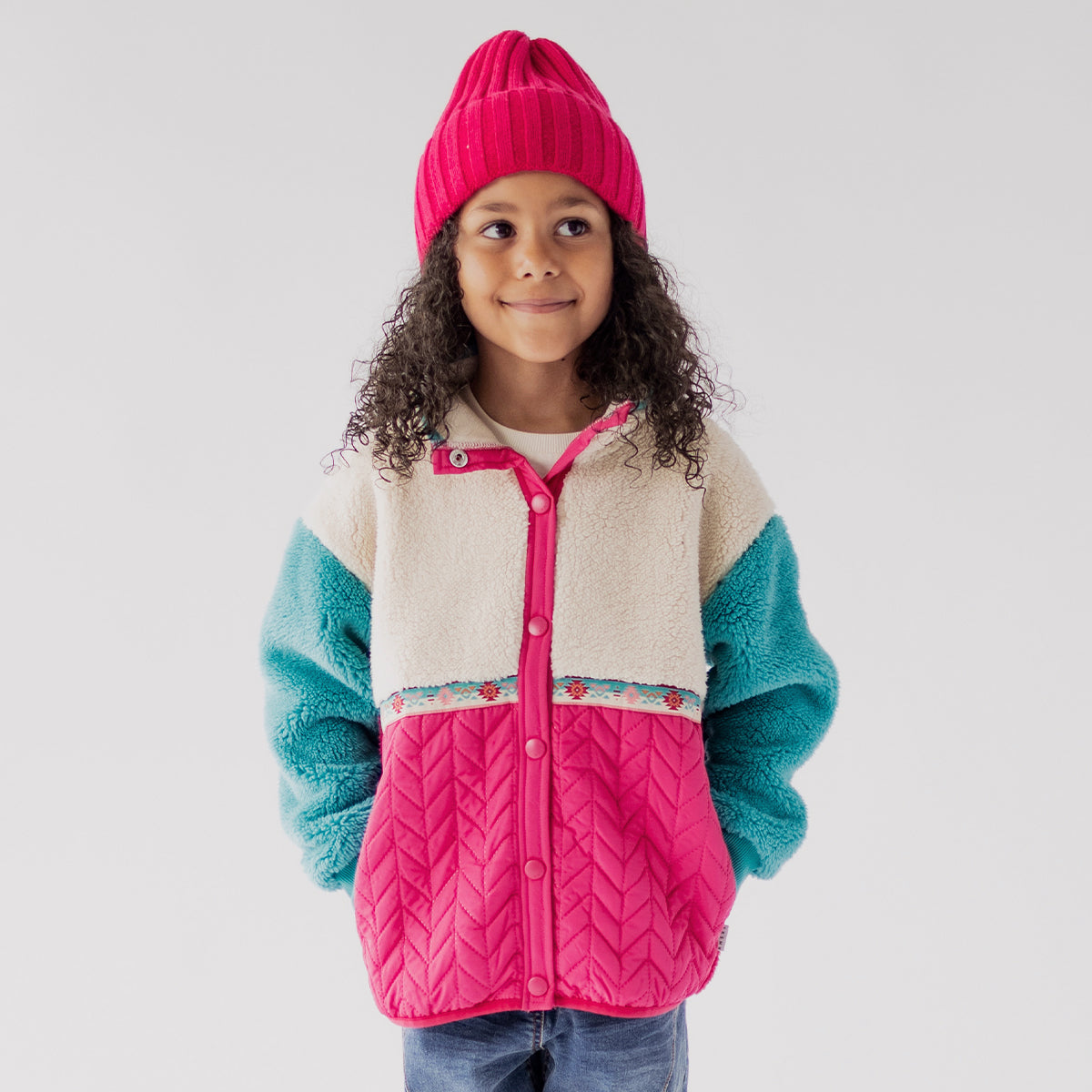 Veste rose et turquoise en peluche, parfaite pour les journées plus froides.